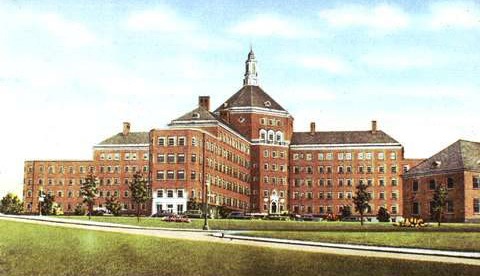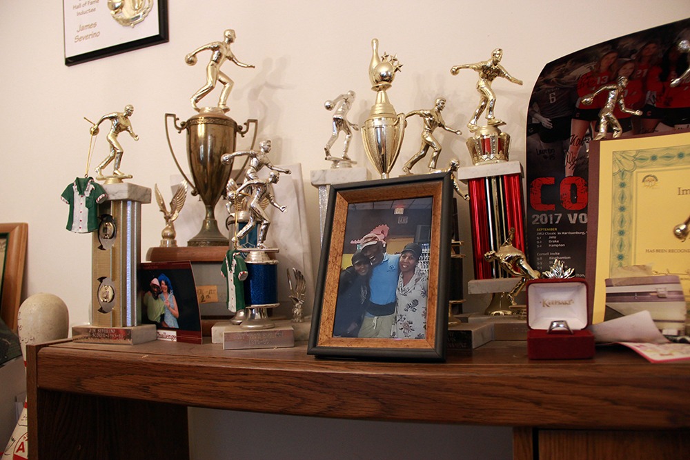Above, Jimmy proudly displays his huge collection of bowling trophies. Below, a 1950s postcard of the Willowbrook State School.