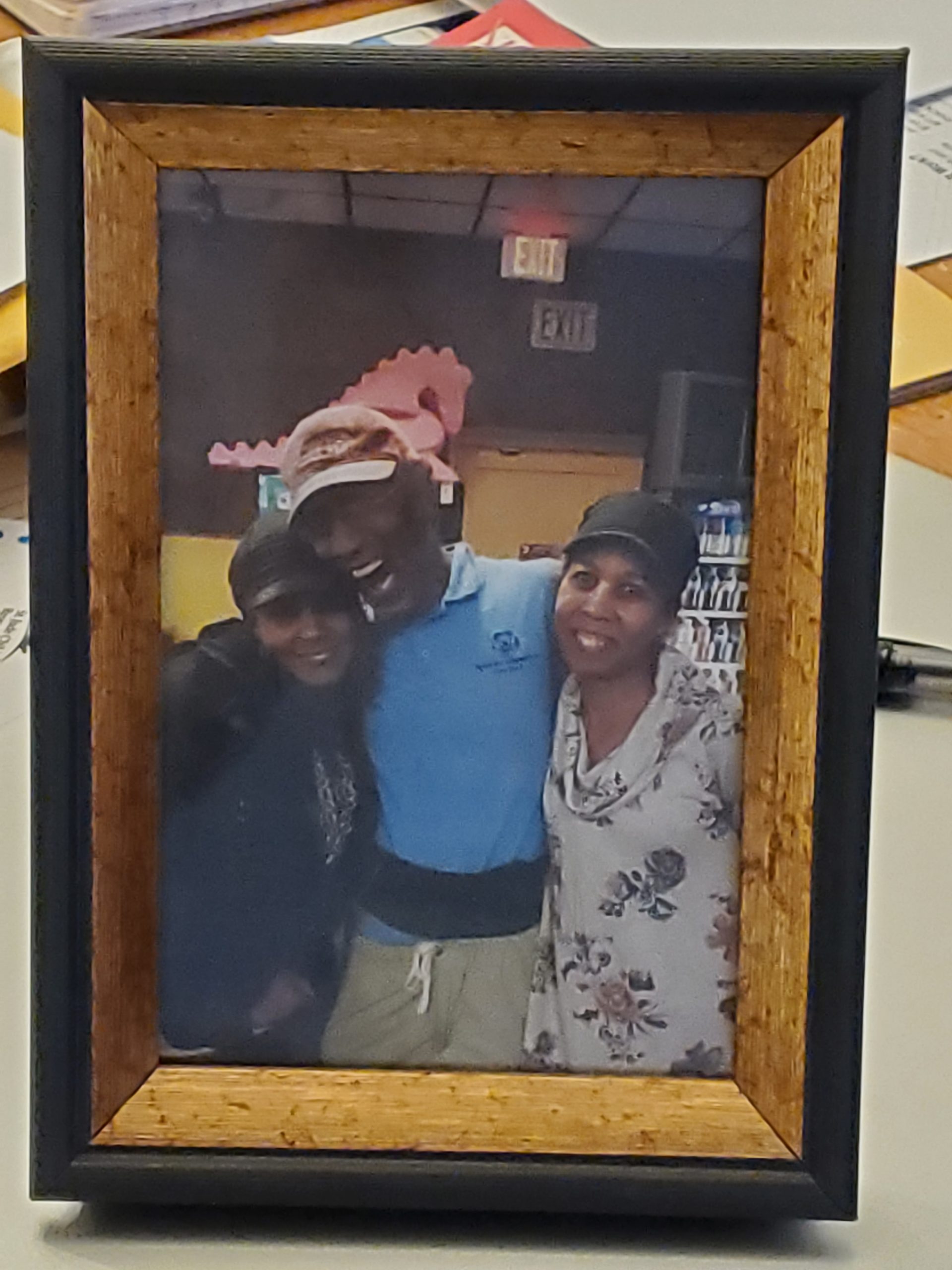 A framed photograph of Jimmy with his two sisters. Jimmy found his siblings after taking a DNA/genealogy test through an online agency and they were delighted to meet each other!